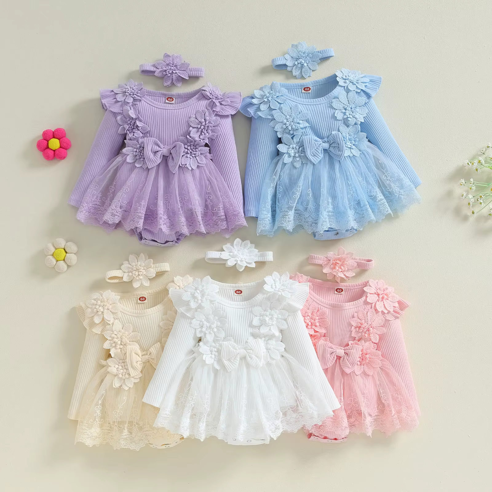 ma&baby 1-18M Newborn Infant Toddler Baby Girls Romper Lace Flower Bow Long Sleeve Jumpsuit Headband Fall Spring Outfits