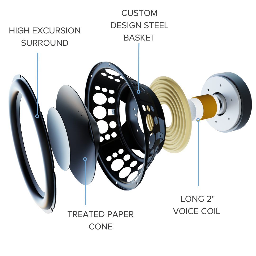 Treated paper cone with a large 2.0” voice coil for increased power handling and thermal management, resulting in higher output SPL.